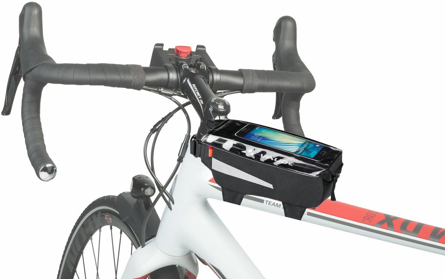 Cette pochette de cadre Vaude Carbo Guide Bag se fixe sur le tube supérieur de votre vélo électrique. Elle vous permettra de garder vos effets personnels (batterie nomade, porte-monnaie, en-cas) à porter de main et de glisser votre smartphone (jusqu’à 5,1″) dans la housse amovible et étanche intégrée.